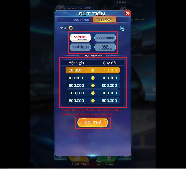 Bước 2: Tại Trang Rút tiền thẻ cào, bắt đầu với việc lựa chọn Nhà mạng viễn thông mà bạn muốn lấy thẻ cào: Viettel, Vinaphone, Mobifone, Vietnamobile. Chọn mệnh giá thẻ cào từ tối thiểu 50.000 đồng đến tối đa là 500.000 đồng.