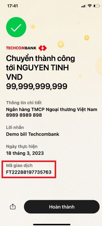 Chuyển khoản xong bằng ngân hàng Techcombank, bạn sẽ nhận được thông báo chuyển khoản thành công. Trong thông báo này cũng sẽ có đầy đủ thông tin giao dịch mà bạn vừa thực hiện bao gồm: Số tiền chuyển, Tài khoản người nhận, nội dung và thời gian giao dịch.