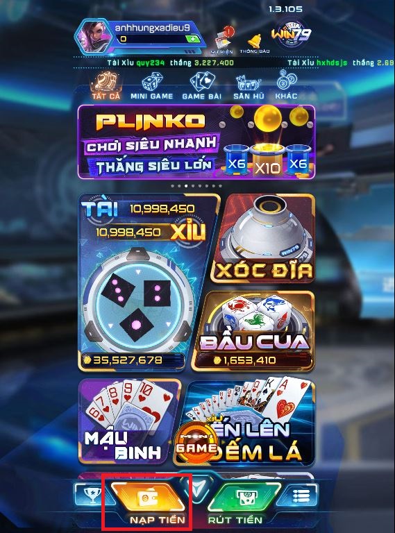 Bước 1: Bạn thực hiện truy cập tài khoản Win79, tại sảnh game chính nhấn chọn NẠP TIỀN.