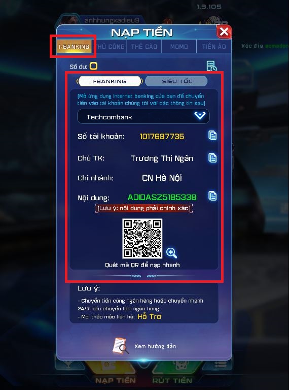 Cách nạp tiền Win79 qua I-Banking Techcombank