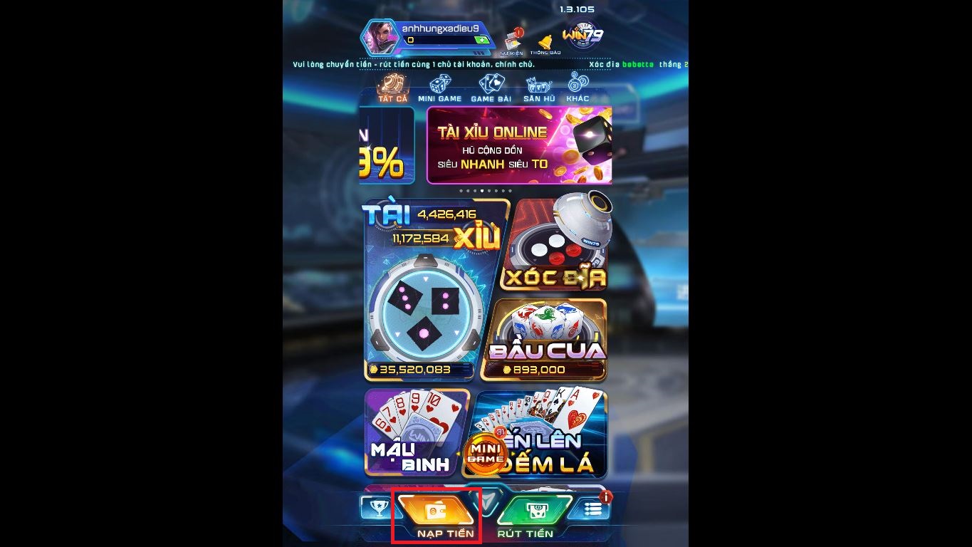 Bước 1: Ngay tại sảnh chính game Win79, bạn nhấn vào nút NẠP TIỀN ở phía dưới màn hình.