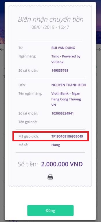 Cụ thể là khi bạn nhận được biên lai giao dịch thành công từ ngân hàng VP Bank, trong biên lai sẽ có đầy đủ các thông tin liên quan đến giao dịch. Bạn có thể thấy dòng Mã giao dịch ngay trên biên lai. Sử dụng mã này để điền vào mục tương ứng trong lệnh nạp tiền của bạn tại Win79 để được xét duyệt cộng tiền vào tài khoản.