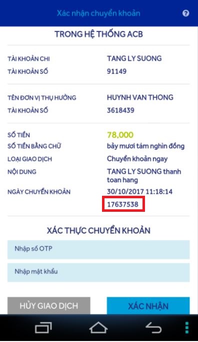 Sử dụng Mã giao dịch đó để kiểm tra thông tin giao dịch bao gồm: Số tài khoản nhận, chủ tài khoản, nội dung chuyển khoản, số tiền, thời gian giao dịch. Giữ lại những thông tin liên quan đến giao dịch bằng cách chụp lại màn hình giao dịch ACB. Bởi những thông tin này sẽ rất hữu ích khi bạn gặp vấn đề về giao dịch.