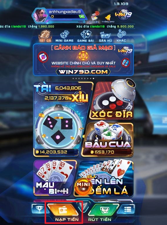 Bước 1: Tại sảnh game trang chủ Win79, nhấn chọn vào mục NẠP TIỀN.