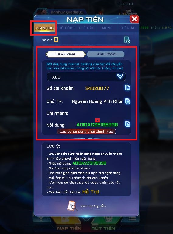 Cách lấy mã giao dịch ACB điền vào lệnh nạp Win79