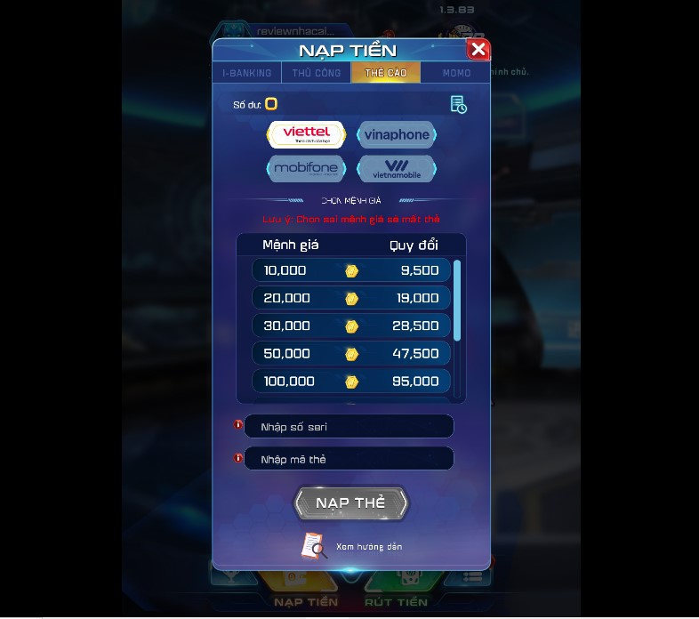 Bước 3: Điền thông tin thẻ cào nạp mà bạn đang sở hữu bao gồm: Mệnh giá (từ 10.000 đồng đến 1.000.000 đồng), Số Seri thẻ, Nhập Mã thẻ cào.