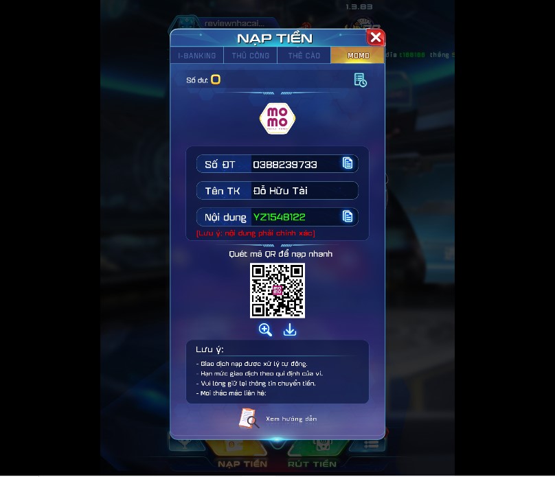 Bước 2: Tại trang Nạp qua Momo, lấy thông tin ví điện tử mà Win79 cung cấp để thực hiện chuyển khoản bằng Momo bao gồm: Số Điện Thoại, Tên Tài khoản, Nội dung. Hoặc bạn cũng có thể quét mã QR được Win79 cung cấp bằng App Momo để chuyển khoản nhanh.