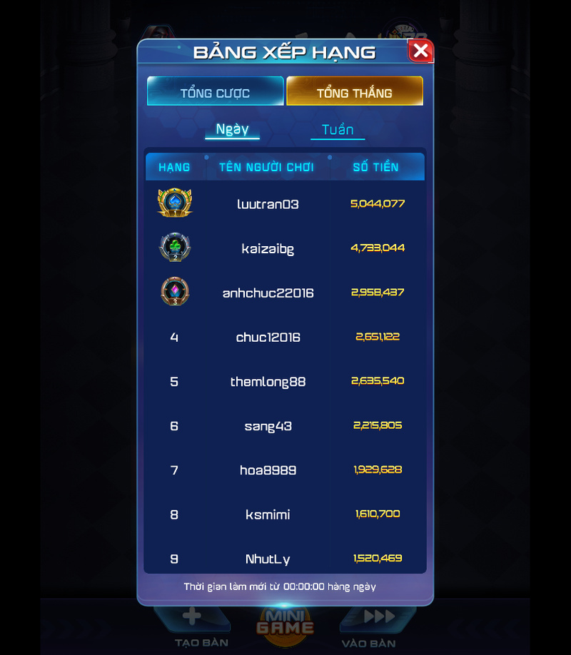 Để tăng theo tinh thần và ý chí cho anh em, chúng tôi sẽ gửi đến anh em bảng xếp hạng thắng tiền trong ngày hôm nay. Những con số biết nói này chắc hẳn sẽ giúp anh em tăng thêm hứng thú khi chơi.