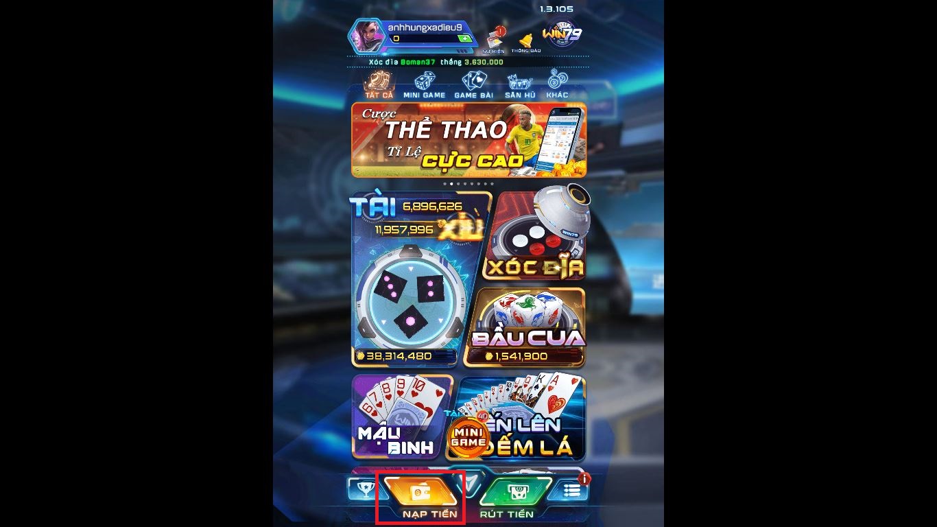Bước 1: Bạn thực hiện truy cập trang chủ Win79, nhấn nút Nạp Tiền ở trang chủ.