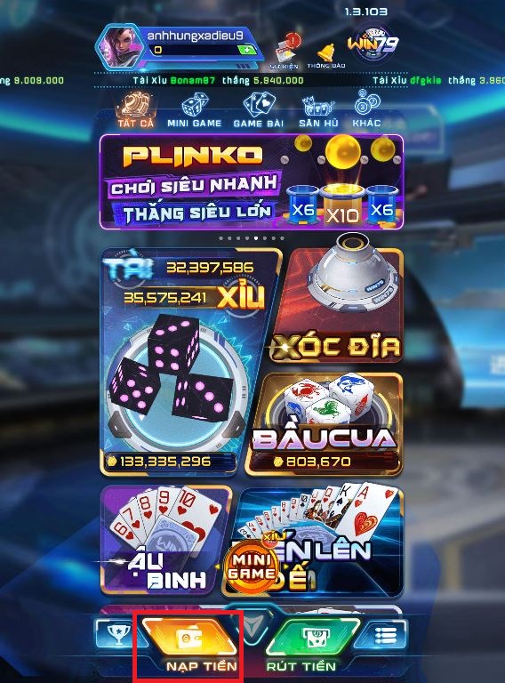 Bước 1: Bạn truy cập vào cổng game Win79, tại sảnh game nhấn nút NẠP TIỀN.