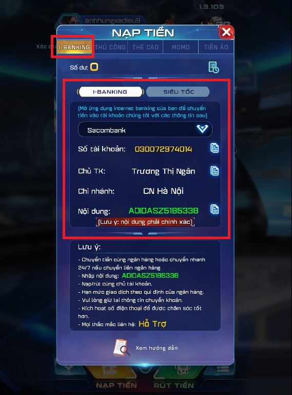 Bước 3: Ở phương thức Nạp I-Banking, tiếp tục với ngân hàng Sacombank. Bạn sẽ được cung cấp những thông tin như: Số tài khoản, Tên Chủ tài khoản, Chi nhánh và Nội dung giao dịch (Mã nạp tiền). Sử dụng các thông tin trên để chuyển khoản vào ngân hàng Sacombank.