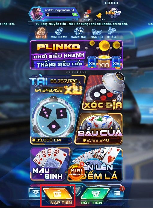 Bước 1: Sau khi truy cập vào trang chủ Win79, bạn lựa chọn nút NẠP TIỀN ở phía dưới màn hình chính.