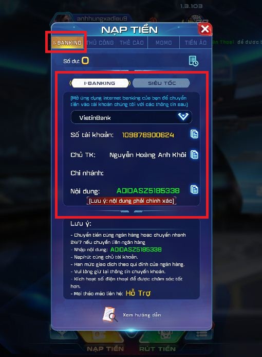 Lưu ý khi thực hiện Nạp tiền Vietinbank tại Win79